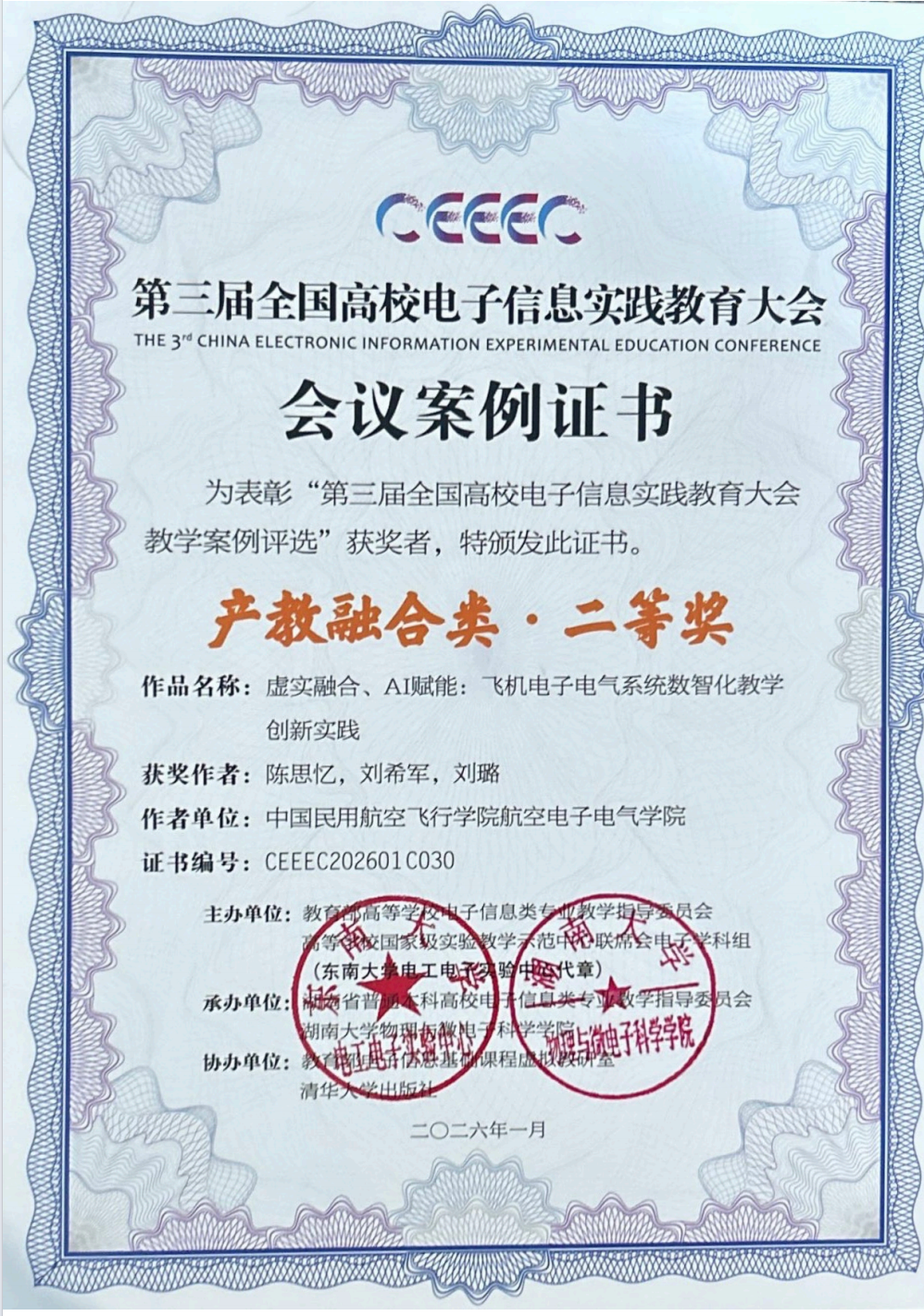 在本次大会教学案例评选中,由航空电子电气学院陈思忆、刘希军、刘璐教师团队撰写的教学案例《虚实融合、AI赋能:飞机电子电气系统数智化教学创新实践》荣获产教融合类二等奖。该案例围绕航空电子电气专业人才培养需求,通过将虚拟仿真技术与人工智能技术引入教学过程,构建“虚实结合、数智赋能”的教学模式,探索电子电气系统类课程的实践教学创新路径,体现了学院在产教融合与教学改革方面的积极探索。