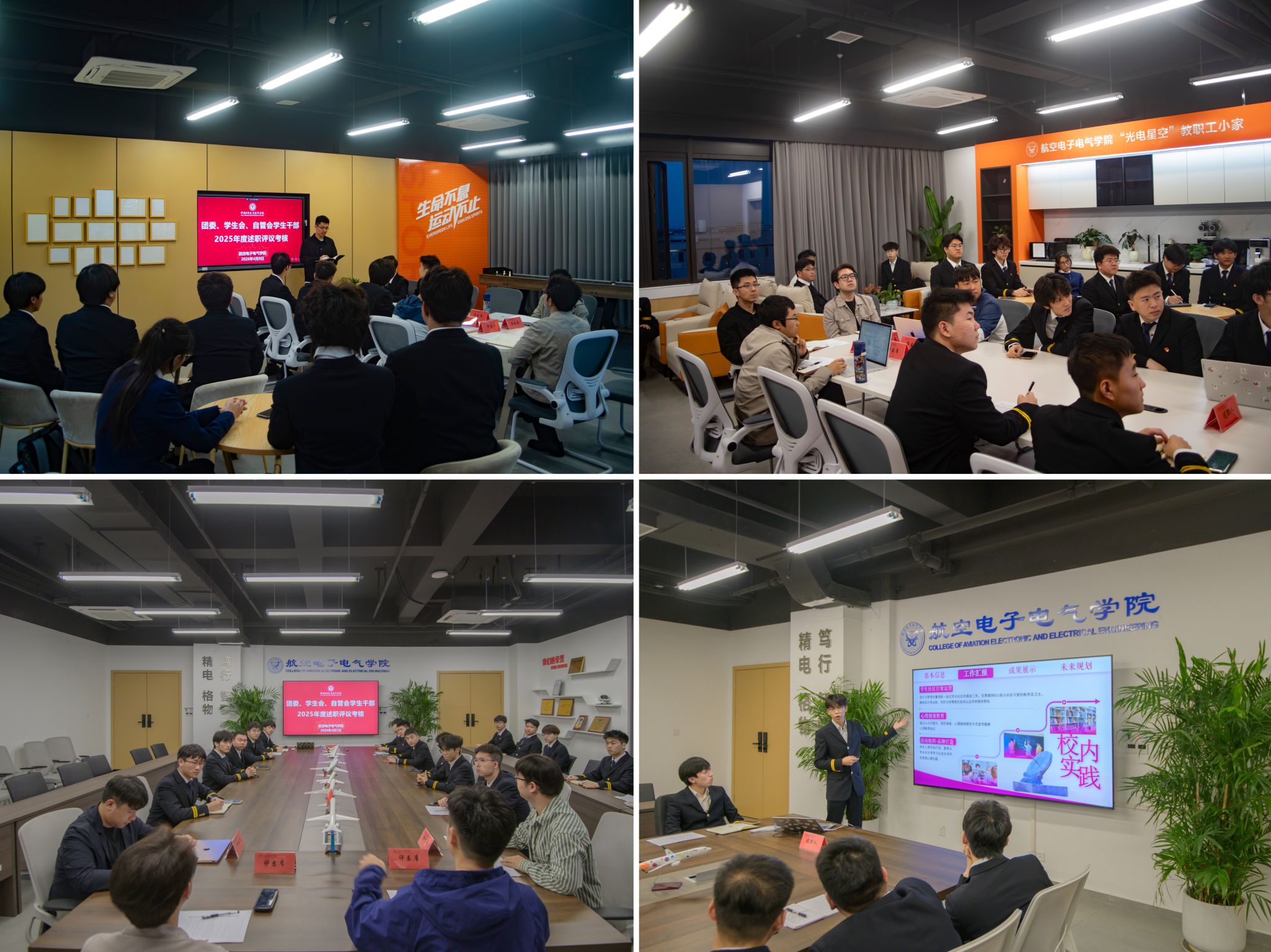 本网讯 马予晨 报道:为进一步加强学生骨干队伍建设,全面总结2025年度工作成效,科学谋划2026年重点任务,航空电子电气学院于4月7日至8日组织开展了2025年度团委、学生会、自管会述职评议考核工作。学院党委袁江副书记到会指导,全体辅导员参与评议。