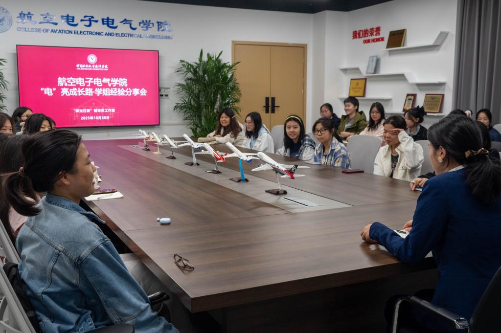 本网讯 刘勇 报道: 为帮助学院本科女生明晰学业规划方向、做好求职准备,有效破解成长路上的迷茫与困惑,搭建“朋辈互助”交流桥梁,实现优质成长经验的高效传递,2025年10月30日晚,航空电子电气学院“晖光日新”辅导员工作室在B2-7062会议室举办“光引成长路·聚力共前行”学姐经验分享会。分享会邀请2022级电气工程及其自动化专业学生党员赵梦琴担任主讲人。学院全体本科女生到场参与交流、共汲成长力量。