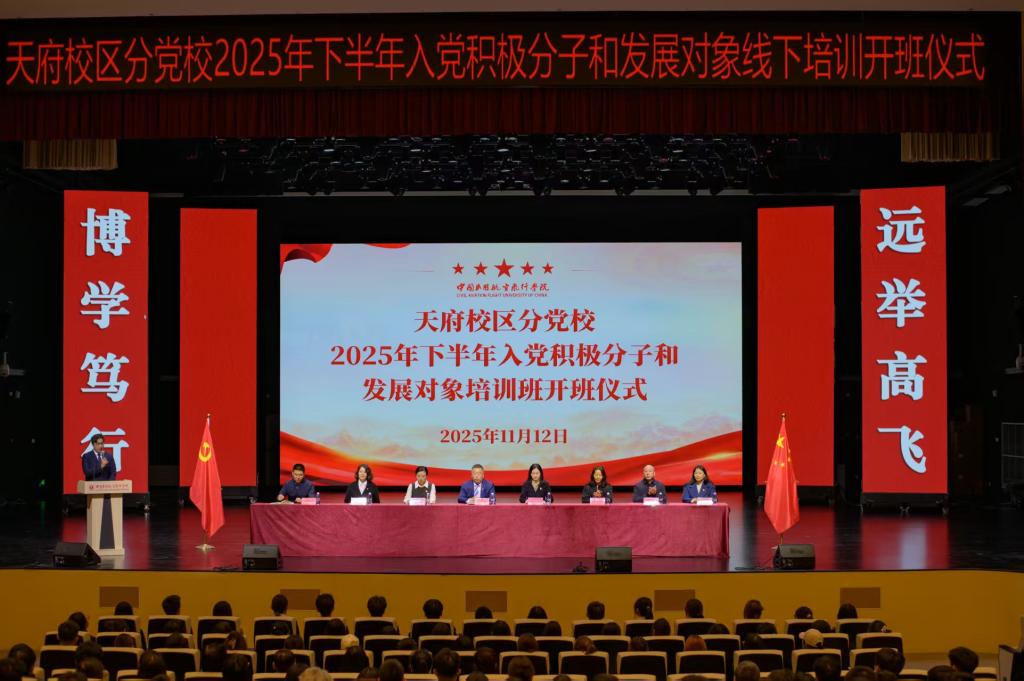 本网讯 王雪香 报道: 为加强党员队伍建设,筑牢入党积极分子和发展对象的思想根基,11月12日19:00,天府校区分党校2025年下半年入党积极分子和发展对象线下培训班开班仪式在弘毅会堂举行。学校党委副书记、组织部部长、党校校长王维正,党委组织部、天府校区分党校、天府校区各二级学院领导、老师以及420名培训学员出席开班仪式。仪式由何宇健老师主持。