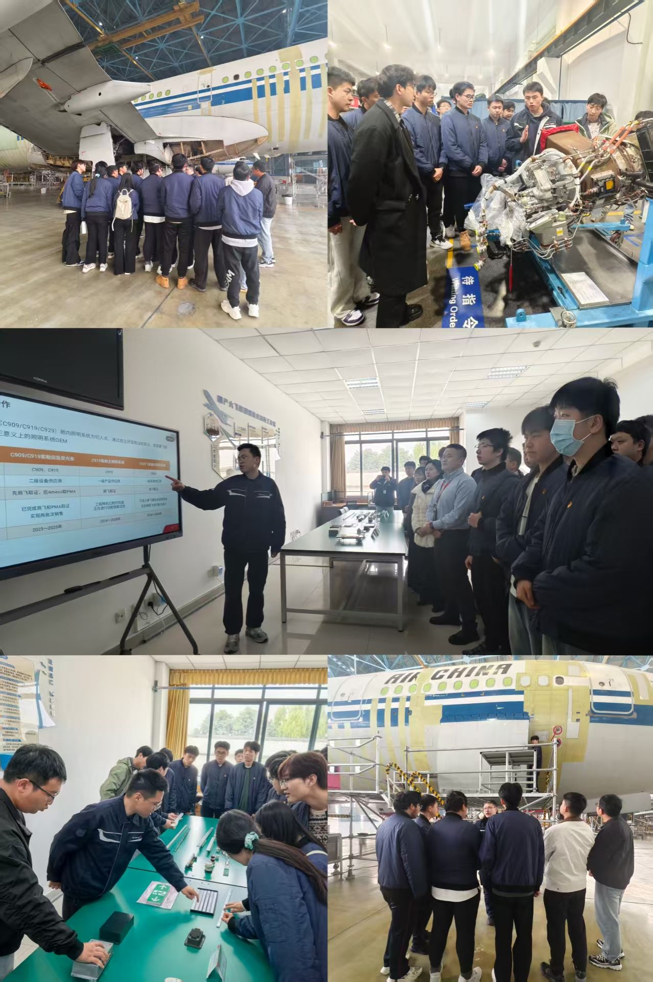在北京飞机维修工程有限公司成都分公司党群工作部部长陈佳彬、工程师杨胜峰的带领下,师生分组深入辅助动力装置创新工作室、成都大修客改货创新工作室、国产大飞机照明技术创新工作室、中航集团劳模和工匠人才创新工作室。技术骨干们结合实际案例,细致讲解民航装备维修工艺、创新技术研发历程,从客改货核心流程到国产大飞机照明系统适配细节,用专业解读点燃学员探索热情。现场随处可见学员驻足追问、记录要点的身影,专业探讨与技术交流的氛围十分热烈。
