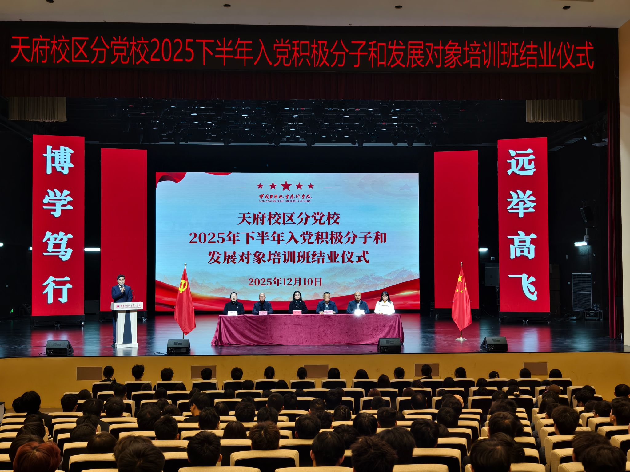 本网讯 王雪香 报道:12月10日晚,中国民用航空飞行学院天府校区分党校2025下半年入党积极分子和发展对象培训班结业仪式在弘毅会堂举行。天府校区分党校轮值校长、航空电子电气学院党委书记邓红缨同志、空中交通管理学院党委书记常卫东同志、航空工程学院党委副书记吴斌同志、航空气象学院党委副书记高峰同志、外国语学院党委副书记段震同志、理学院党委副书记何誉杰同志、教师代表以及全体入党积极分子和发展对象参加了结业仪式。