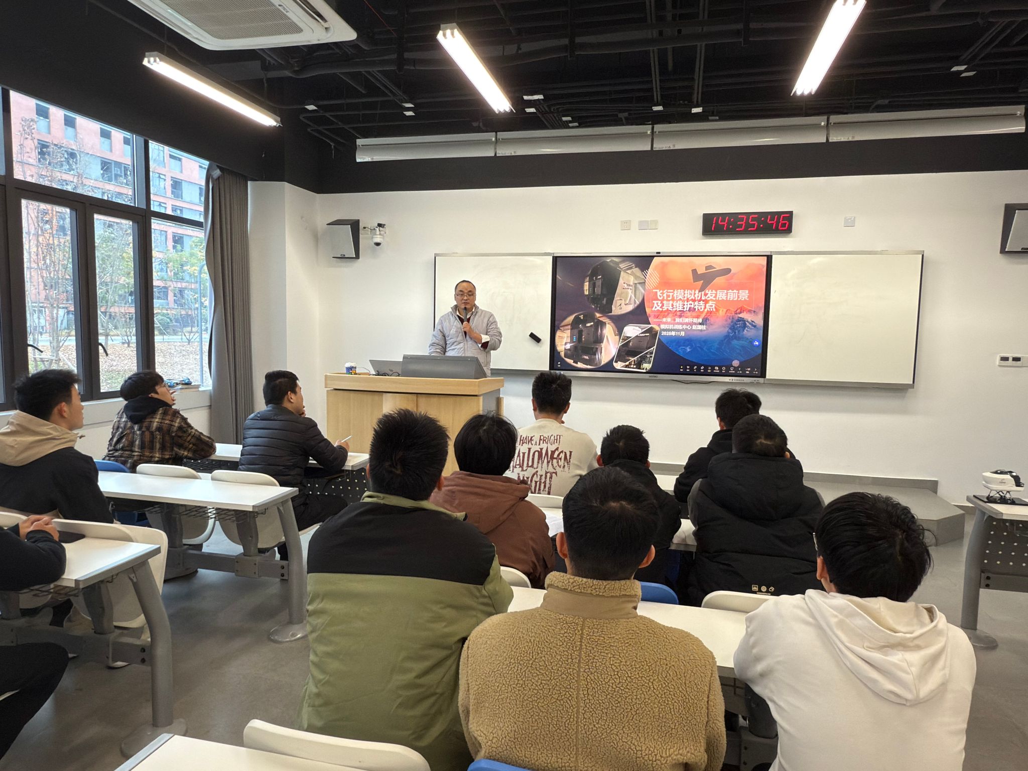 本网讯 雷霞 摄影/报道: 为深入落实高等教育高质量发展要求,强化研究生专业实践能力培养,助力航电领域人才储备与技术创新,12月3日下午14:30,航空电子电气学院(以下简称航电学院)在鸿鹄楼3031,面向学院全体研究生开展“飞行模拟器发展前景和维护特点”主题讲座。本次讲座特邀模拟机中心专家赵国柱老师担任主讲嘉宾,航电学院研究生辅导员雷霞及全体研究生参与活动。