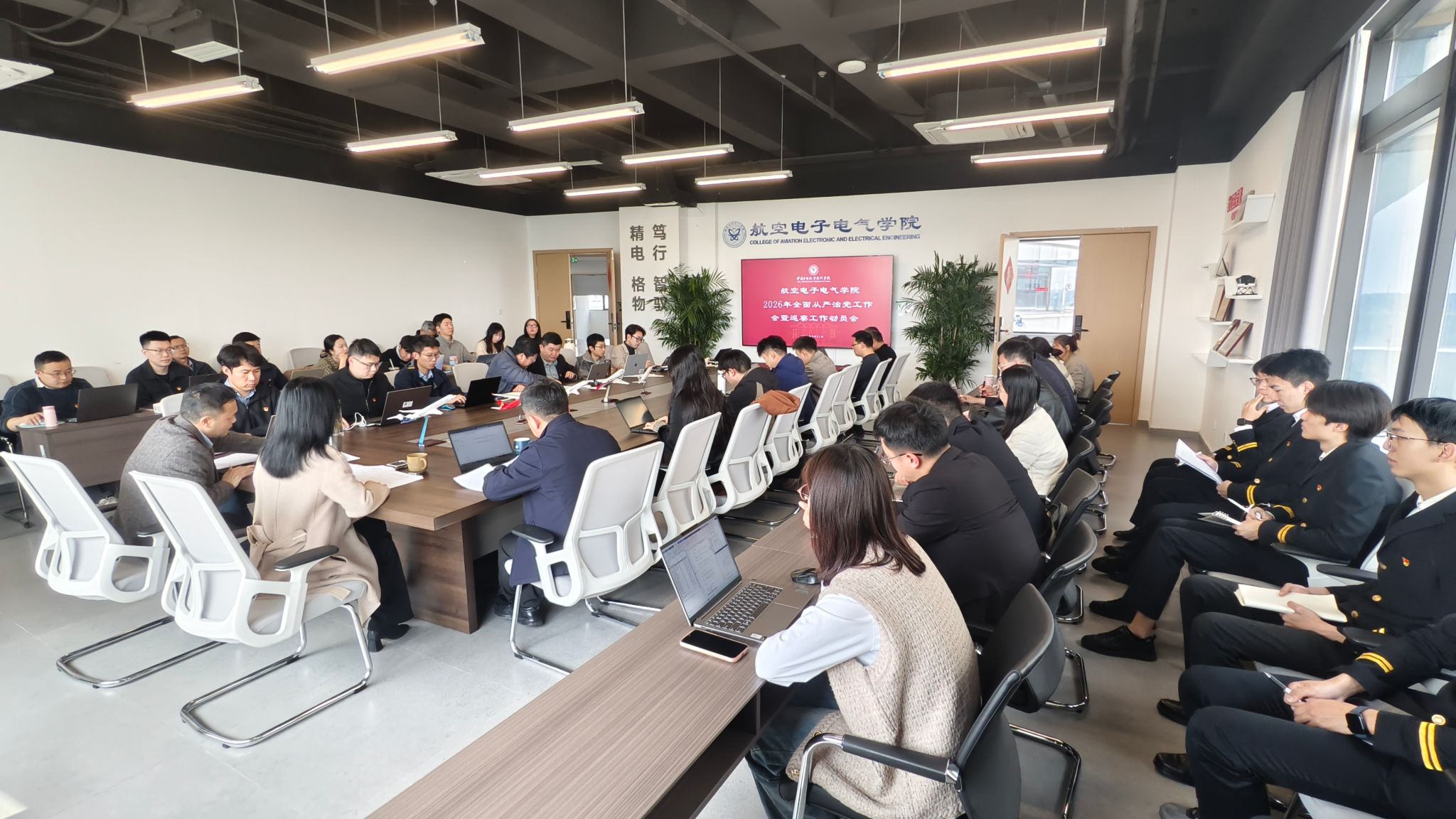 本网讯 马超琼 报道:3月24日下午,航空电子电气学院(以下简称航电学院)在B2-7062会议室召开2026年全面从严治党工作会暨巡察工作动员会。学院领导班子、副科及以上干部、各党支部书记、专兼职辅导员、三办全体人员及师生党员代表共计50人参会。会议由学院党委书记邓红缨主持。